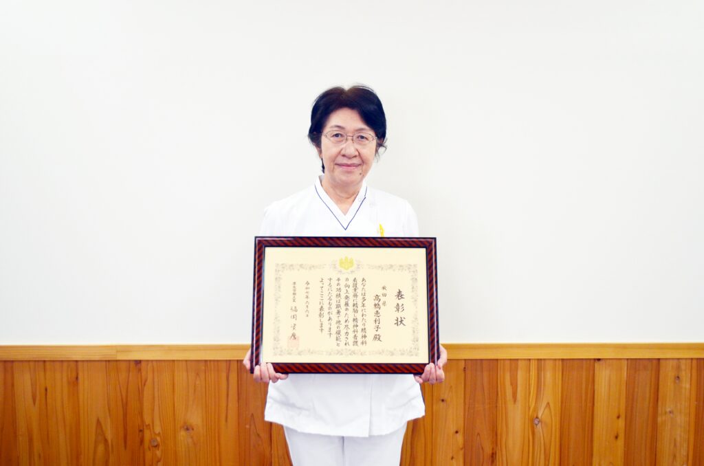令和7年6月6日(金) 当院の院長補佐 髙橋恵利子さんが、一般社団法人日本精神科看護協会学術集会に於いて厚生労働大臣より表彰を受けられました。これは髙橋さんが長年にわたり精神科看護の向上発展の為に尽力されたことに対して表彰されたものです。